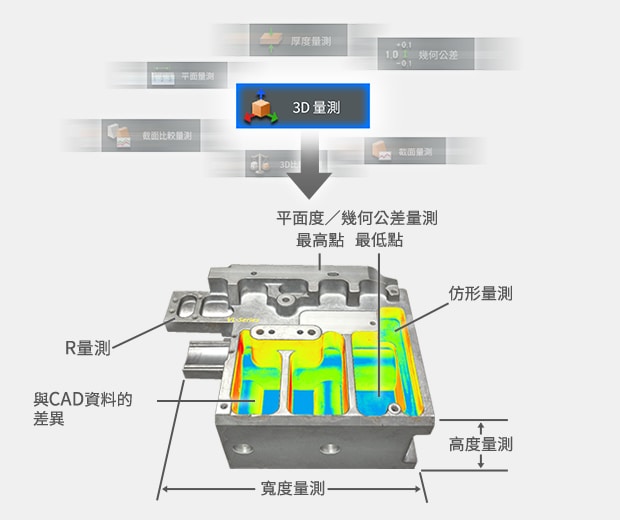3D掃描型三次元量測儀VL-800 系列為系列首度搭載3D-AI。在AI支援下,誰都可以輕鬆取得高品質(zhì)的3D資料。世界首創(chuàng)的新功能「分析建議」,根據(jù)產(chǎn)品形狀,由AI提供最佳的量測方法。此外,透過與3D CAD資料比對和比較,可清楚地將變形、翹曲等情況可視化。並且也可運(yùn)用所取得的高品質(zhì)3D資料,無縫進(jìn)行逆向工程。