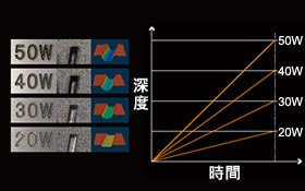 UV雷射(波長 355 nm)具有對各類材料極高吸收率的特性。針對以往使用基本波長(1,064 nm)的雷射刻印機(jī),容易產(chǎn)生熱影響或在某些材質(zhì)上辨識度不佳的情況,UV雷射刻印機(jī)能實(shí)現(xiàn)高顯色、無損傷的精細(xì)刻印與加工。此外,搭配刻印頭內(nèi)建的測距感測器與多功能CAMERA,可自動補(bǔ)正與目標(biāo)物之間的距離偏移及搬運(yùn)過程中的位置偏移。並且透過雷射輸出監(jiān)控與窗口髒污檢測,預(yù)防刻印不良,實(shí)現(xiàn)穩(wěn)定運(yùn)行。