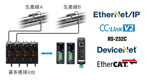 為了同時(shí)收集並輸出目標(biāo)物的靜電量及周圍的溫濕度資料,感測(cè)器標(biāo)準(zhǔn)配備獨(dú)立的三通道判斷輸出,以及類比電壓與電流輸出功能。此外,透過搭配通訊模組,可整合傳送主模組與擴(kuò)充模組所連接的最多八臺(tái)設(shè)備的資料。亦可由PC或PLC端讀取資料與修改設(shè)定值,進(jìn)一步大幅縮短工時(shí)、提升作業(yè)效率。