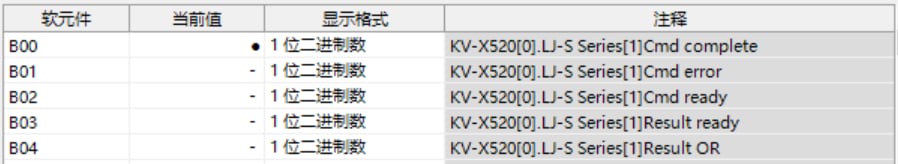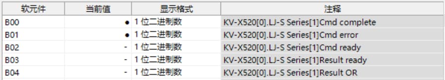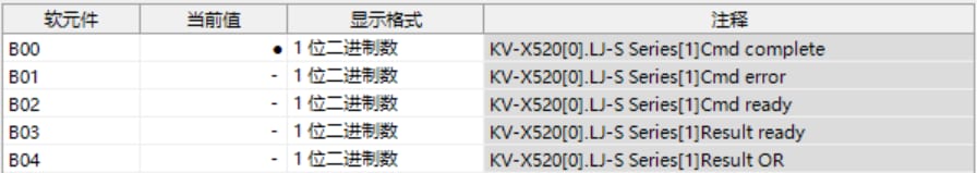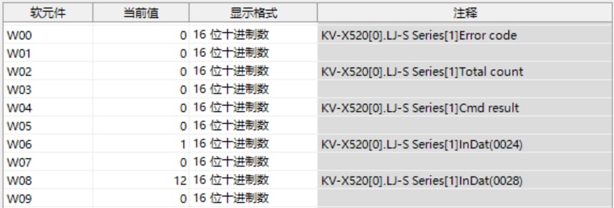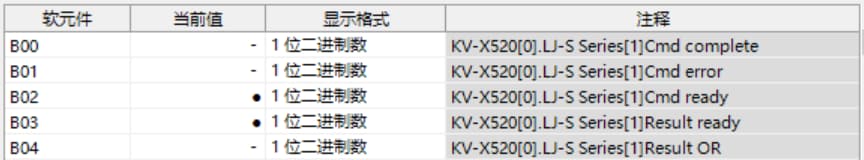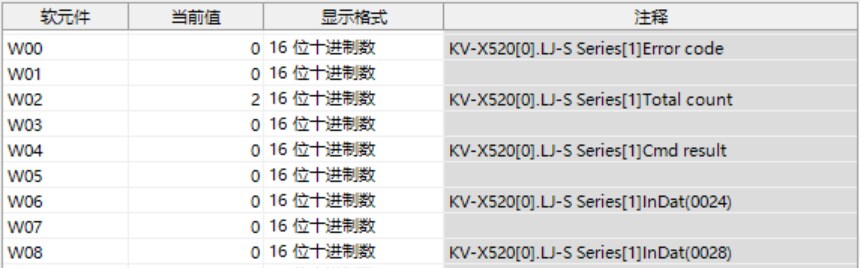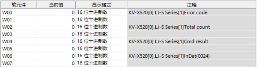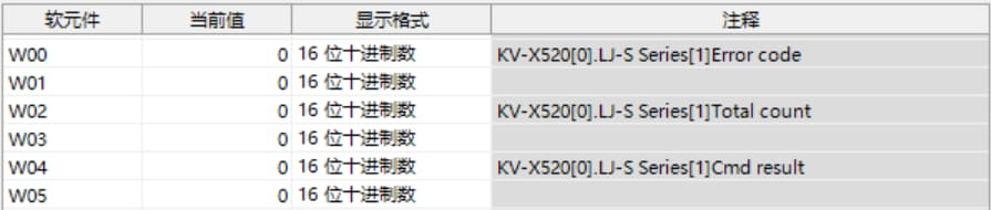 表中所示的 W**** 是僅將一個(gè) LJ-S8000 系列連接至 KV-X 系列 CPU 單元作為 EtherNet/IP 設(shè)備時(shí),鏈路中繼和鏈路暫存器分配至地址的範(fàn)例。如果設(shè)定了初始值,LJ-S8000 會(huì)從 W0 開始以遞增的順序分配。