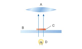 A:鏡頭 B:光源 C:半反射鏡 D:目標(biāo)物