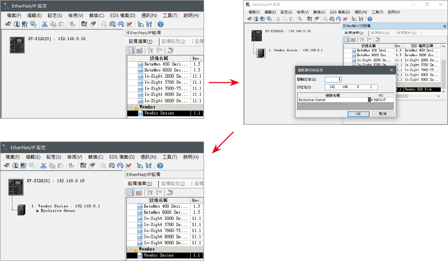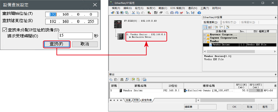 - 手動設(shè)置設(shè)備配置的方法 在“EtherNet/IP 設(shè)定”的 [設(shè)備清單 (1)] 選項卡中,拖放“Vender Series”並創(chuàng)建設(shè)備配置。