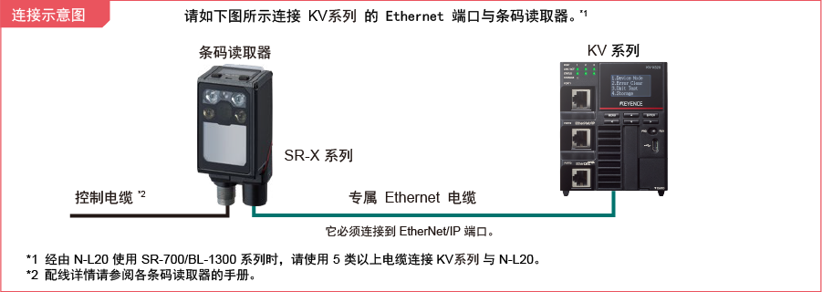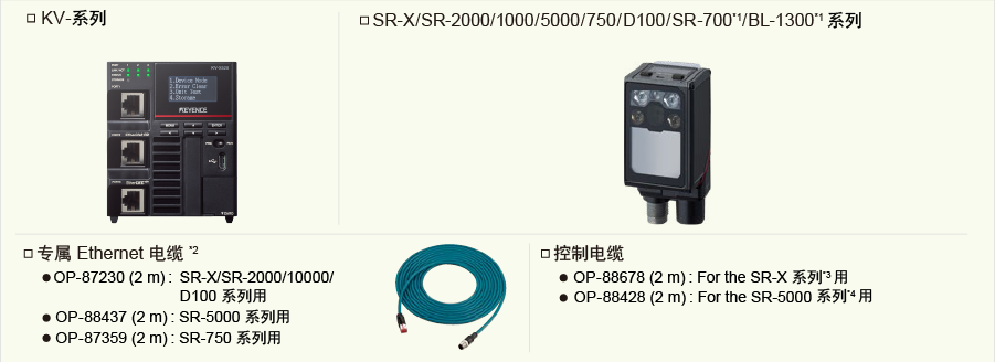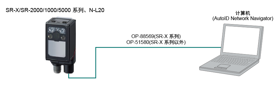 ※1 使用 SR-700/BL-1300 系列時,需要 N-L20(需另外購買)。 ※2 這是連接讀碼器和 PLC 的電纜。使用 N-L20 時不需要此專用電纜。 ※3 此電纜用於連接 24 V 電源供應(yīng)器、I/O 端子和 RS-232C 連接埠。 ※4 使用 SR-5000 系列時,請使用 OP-88437 或類似的選購電源線。